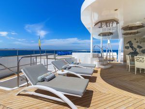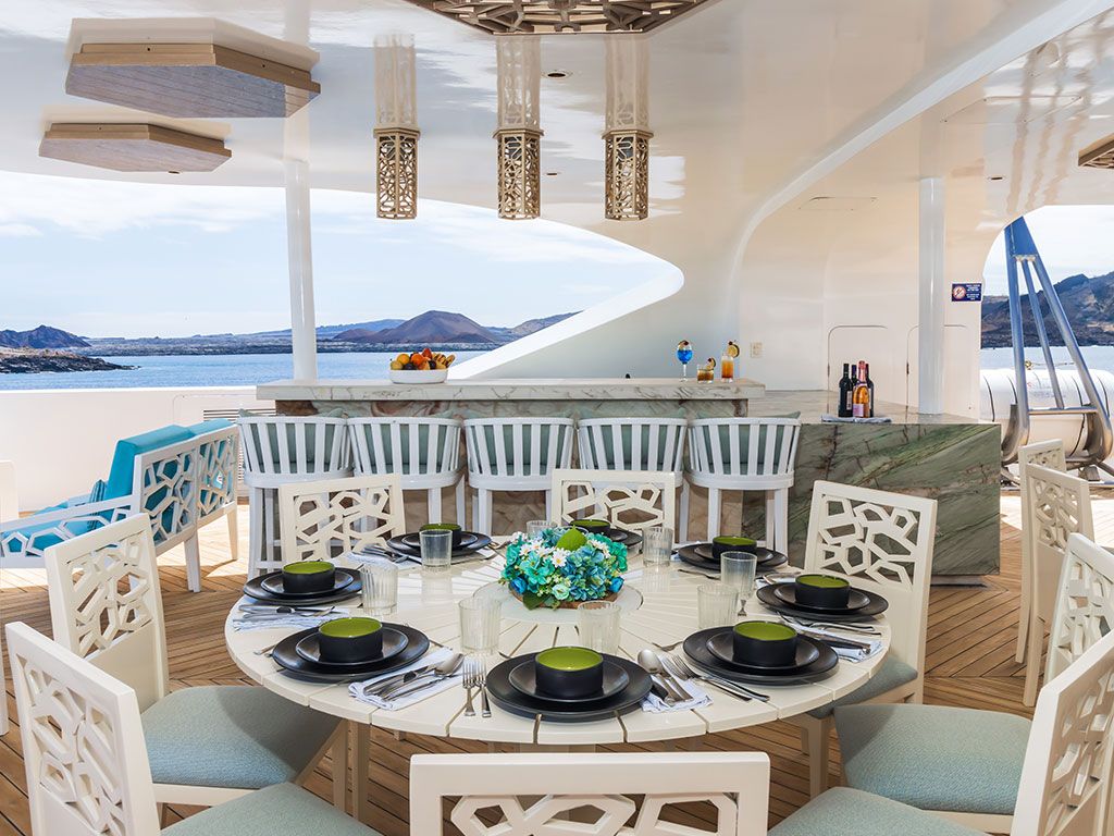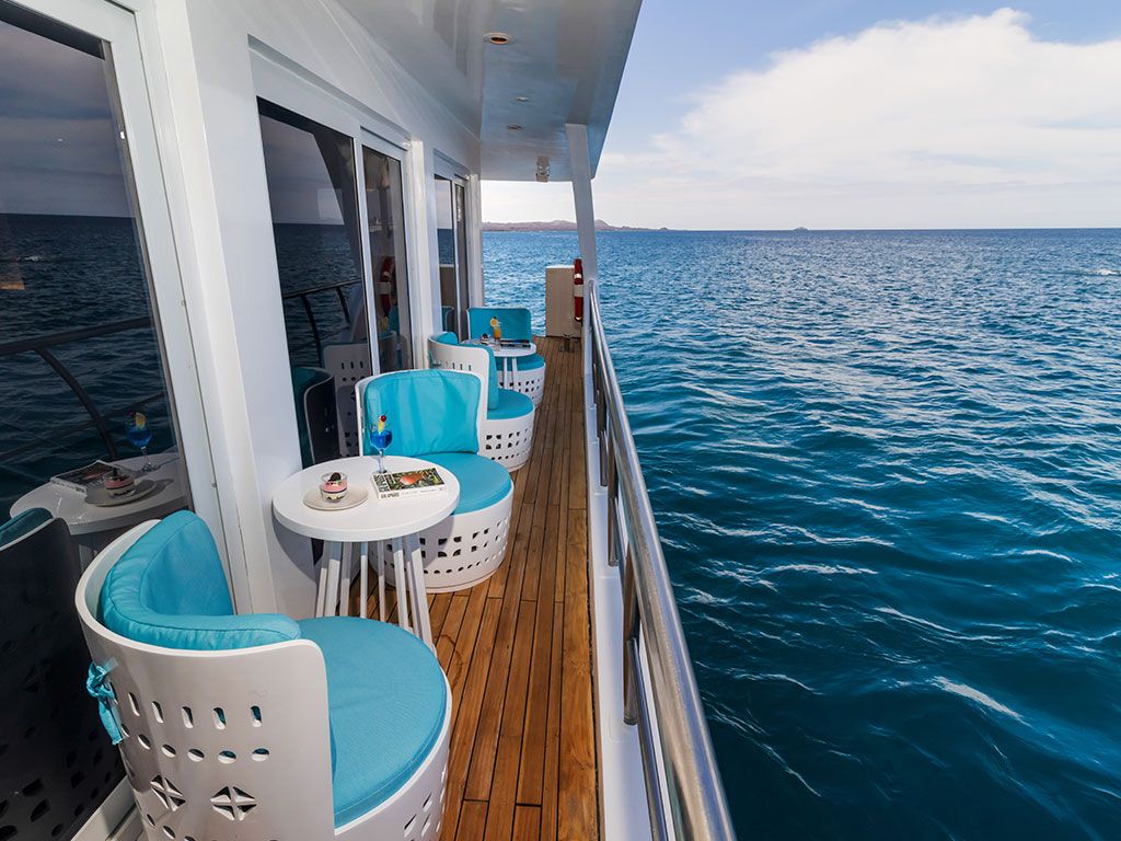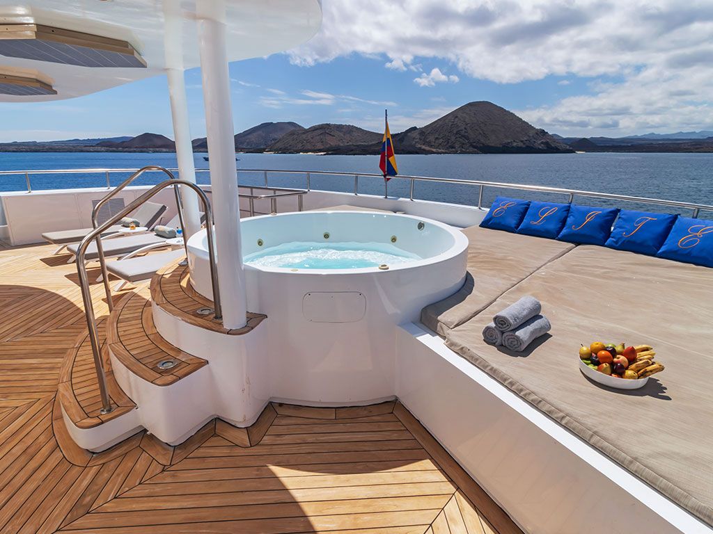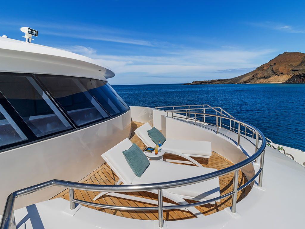 Наблюдайте за Галапагосскими островами в гидромассажной ванне, баре и широких социальных зонах на Sky Deck, где можно отдохнуть, позагорать или пообщаться.