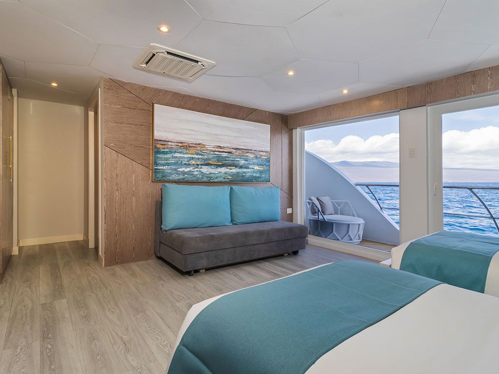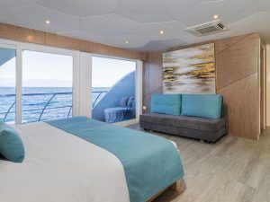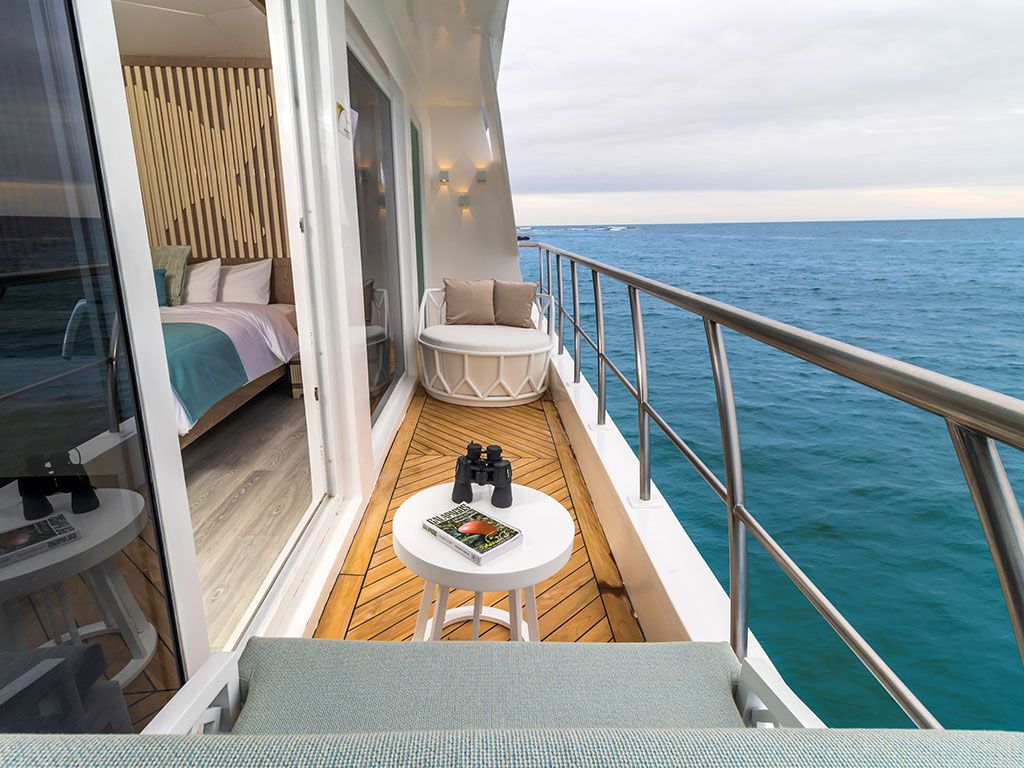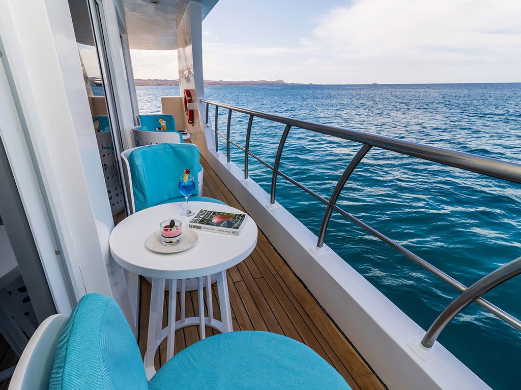 Мы особенно гордимся панорамными окнами в каждом люксе: в отличие от тяжелых круглых иллюминаторов старых яхт, в каждом люксе Elite есть большие окна с панорамным видом. Ваше окно в мир Галапагосских островов – это окно от пола до потолка из стекла со стеклянной раздвижной дверью, ведущей на ваш балкон. Каждое утро и день из вашего номера открывается потрясающий вид на галапагосские пейзажи!