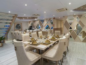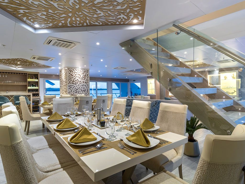 Все люксы и каюты премиум-класса на борту Galapagos Elite просторные, удобные и хорошо обставленные: это идеальное место для отдыха и восстановления сил после дня, проведенного на прогулках по островам. В каждом люксе есть балкон с видом на океан, а также душ в тропическом стиле.Все люксы могут иметь одну двуспальную или две односпальные кровати. Мы особенно гордимся панорамными окнами в каждом люксе: в отличие от тяжелых круглых иллюминаторов старых яхт, в каждом люксе Elite установлены большие окна с панорамным видом. Это даже не окна, а точнее, воспринимайте их скорее как стену из стекла с дверью, ведущей на балкон. Каждое утро и день принесут новый потрясающий морской пейзаж на архипелаге Галапагос! Гостям очень понравятся блюда, которые подаются на борту Elite. Наши специалисты по профессиональной кухне готовят три вкусных питательных блюда в день: завтрак и, главным образом, обед будут подаваться в форме шведского стола, а более элегантный ужин в форме сервировки подается в обеденной зоне на свежем воздухе на частично крытой террасе.
