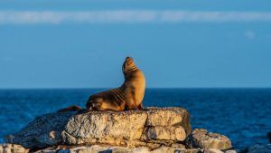 Мокрая высадка на белый песчаный пляж приведет нас к гарему морских львов. Самцы соперничают за право быть секачем, а более мелкие самцы маскируются под самок и делают характерные движения. Галапагосские ястребы часто приближаются близко и садятся на верхушки соляных кустов.
